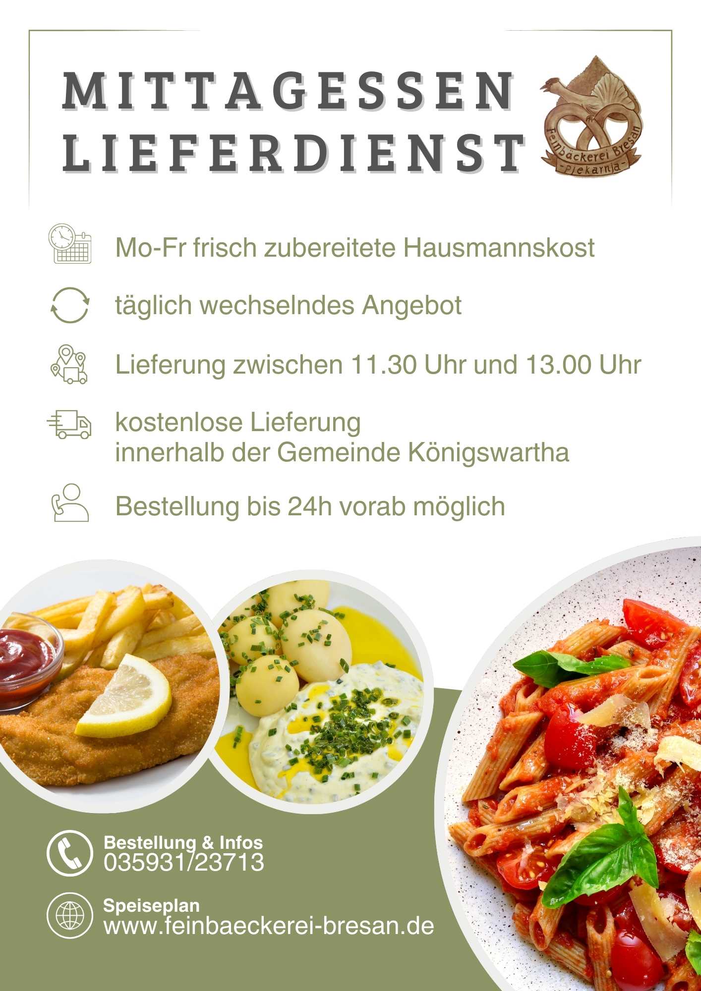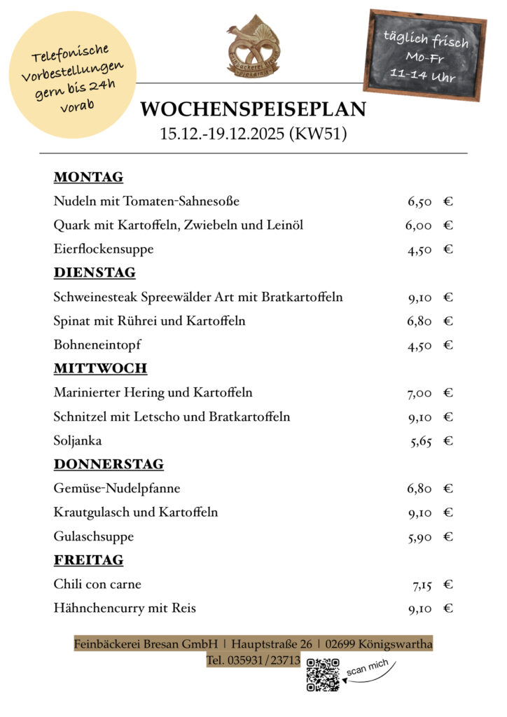 Aktuell Hier gibt es unseren Original Lausitzer Stollen >>> Speiseplan (KW51) Öffnungszeiten Hauptgeschäft Königswartha Angebot gültig ab 08.12.2025 NEU - NEU - NEU Eiscafé ab 2. November Sonntag Nachmittag geschlossen Geheimtipp für jede Veranstaltung Frühstücken in Königswartha - Montag bis Freitag