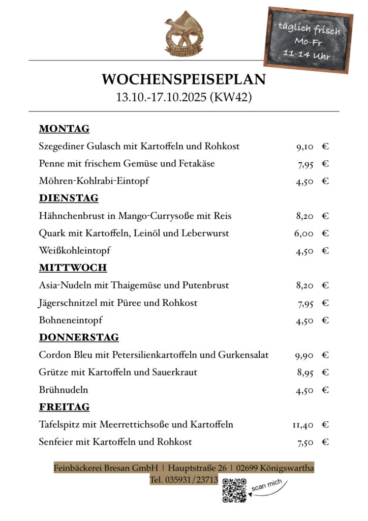 Aktuell Hier gibt es unseren Original Lausitzer Stollen >>> Speiseplan (KW42) NEU - NEU - NEU - ab sofort Mittagessen Lieferdienst Angebot gültig ab 13.10.2025 Eiscafé sonntags ab 6. April geöffnet Geheimtipp für jede Veranstaltung Frühstücken in Königswartha - Montag bis Freitag